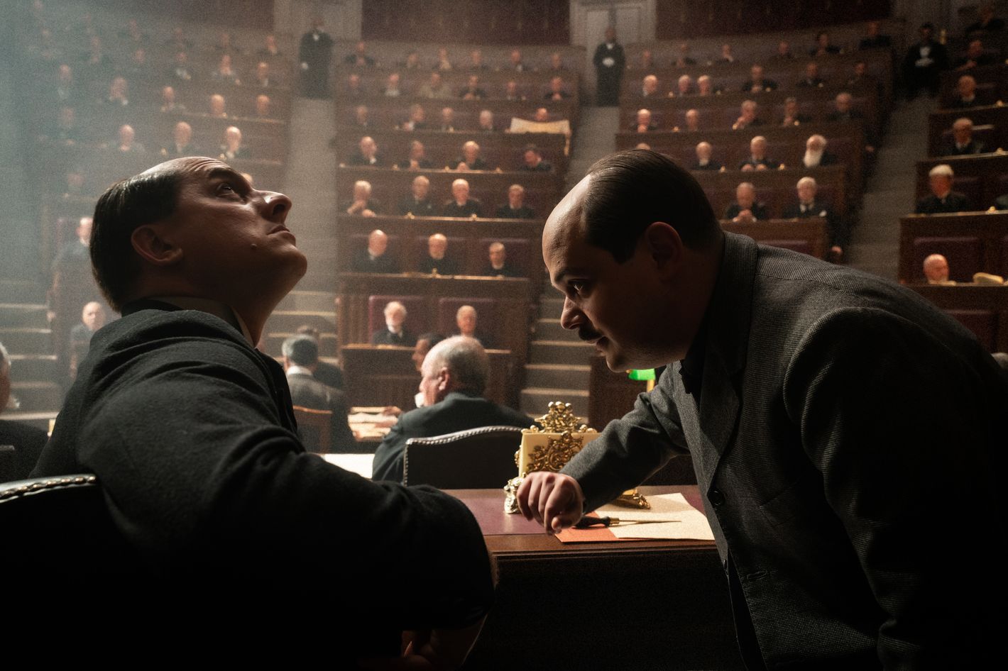 The room is shadowy but lively, with the sense that there are things going on in every speck of the frame. Mussolini stomps and swirls around, the camera keeping him and his increasingly frenzied supporters in sight. The sequence comes into focus as Mussolini ends up behind a projector and spins a film reel — and we jump into what’s being projected, which is the speech we just saw him deliver. Fascism is the only thing that will save “the fatherland,” he proclaims, his message repeating in the room to give the spectators a double dose of what they want to hear. (Note the echoes of ICE’s current “Defend the homeland” slogan.) It’s an Ouroboros of a scene, emphasizing Mussolini watching himself make history to communicate how he recruited Italians to his cause and ensured the rising tide of fascism centered on his image.
